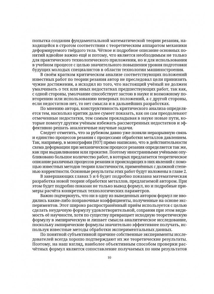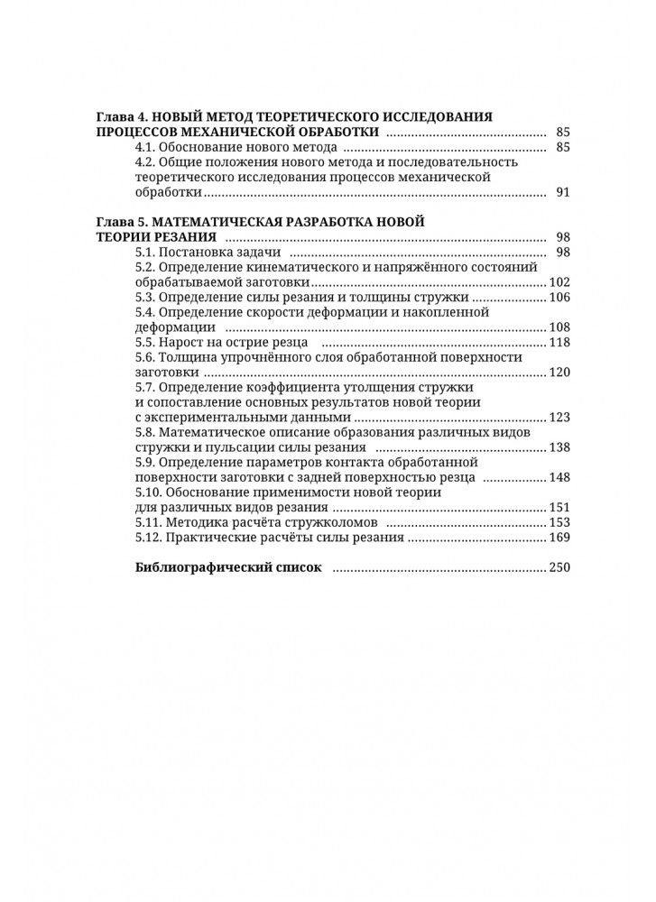 В пятом томе представлен анализ известных теорий механической обработки резанием. Уточнены базовые понятия и важные положения теории резания. Изложена разработанная автором на основе механики деформируемого твёрдого тела принципиально новая механико-математическая теория процессов обработки резанием металлов в машиностроении, позволяющая впервые дать строгое математическое объяснение многих экспериментальных закономерностей и обеспечивающая получение высокоточных расчётных формул без использования каких-либо экспериментальных поправочных коэффициентов. Представлены новые результаты теоретических и экспериментальных исследований различных операций и приведены формулы и методы расчёта основных технологических параметров процессов механической обработки. Показана возможность использования полученных закономерностей в качестве научных основ для разработки прогрессивной технологии резания, и приведены соответствующие примеры выполнения конкретных расчётов. Высокая точность выведенных теоретических формул подтверждена многочисленными сопоставлениями результатов расчёта с экспериментальными данными ведущих специалистов в области обработки металлов резанием.